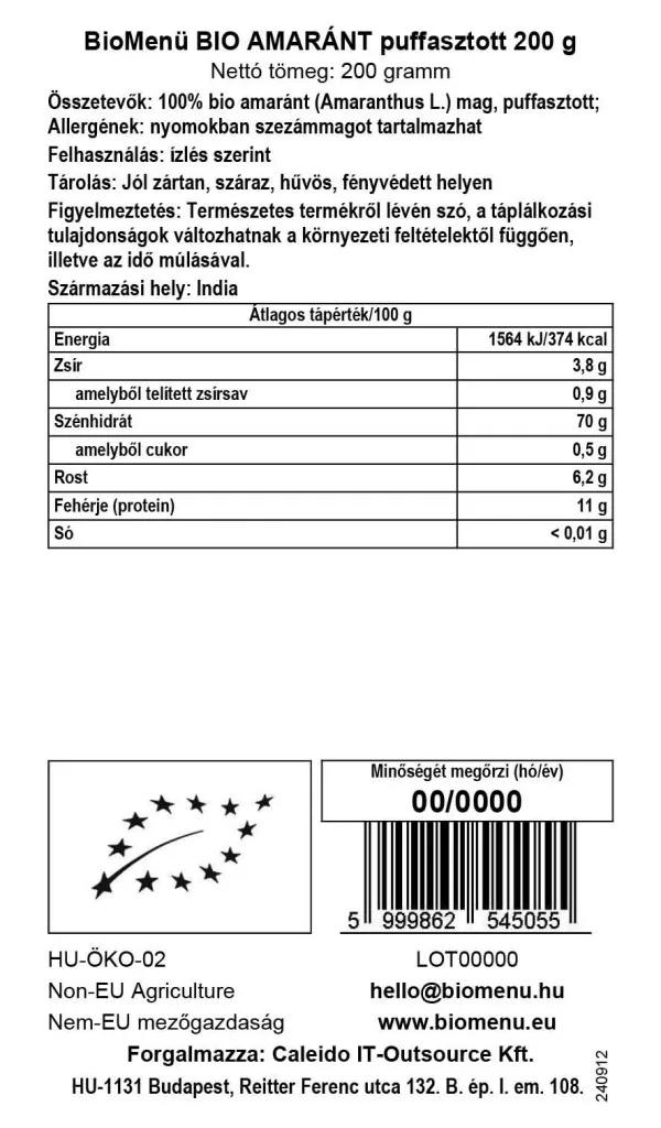 100% semințe organice de amarant (Amaranthus L.), umflate; Alergeni: pot contine urme de seminte de susan