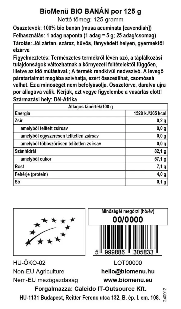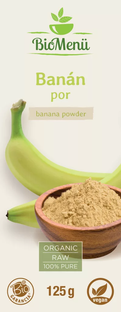 Pudra de banane BioMenü BIO este un produs deosebit de versatil disponibil pe tot parcursul anului. O bază nutritivă extrem de bogată în calorii care umple corpul cu energie sănătoasă. Este un antioxidant bogat în potasiu, calciu și magneziu și are un conținut foarte mare de fibre.