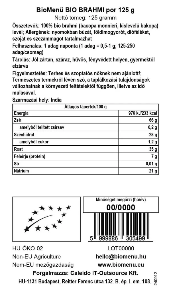 100% frunze organice de Brahmi (bacopa monnieri, bacopa cu frunze mici). Poate contine urme de grau, arahide, nuci, soia si seminte de susan.