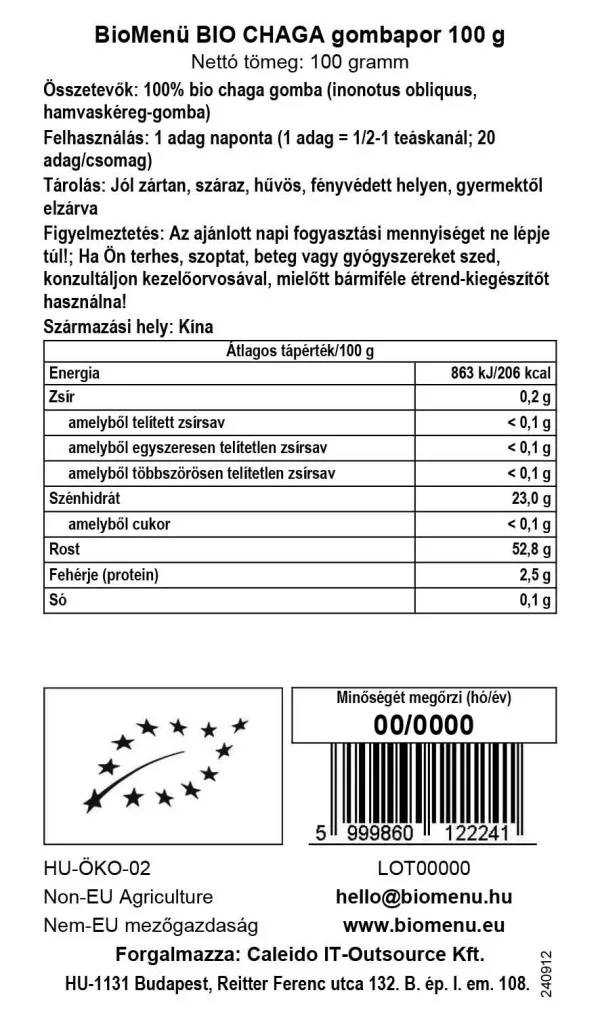 Pulberea organică de chaga este făcută din 100% ciupercă cu coajă de cenușă (inonotus obliquus), cunoscută și sub denumirea de ciupercă chaga. Inonotus obliquus este originar în principal din pădurile de mesteacăn din emisfera nordică. Pudra de ciuperci BioMenü BIO CHAGA are un conținut foarte mare de polizaharide și antioxidanți, care pot ajuta la restabilirea echilibrului organismului și la îmbunătățirea funcționării sistemului imunitar. Amestecați-l cu smoothie-ul sau sucul dorit sau pur și simplu adăugați-l într-o cană de apă fierbinte, cum ar fi ceaiul instant.