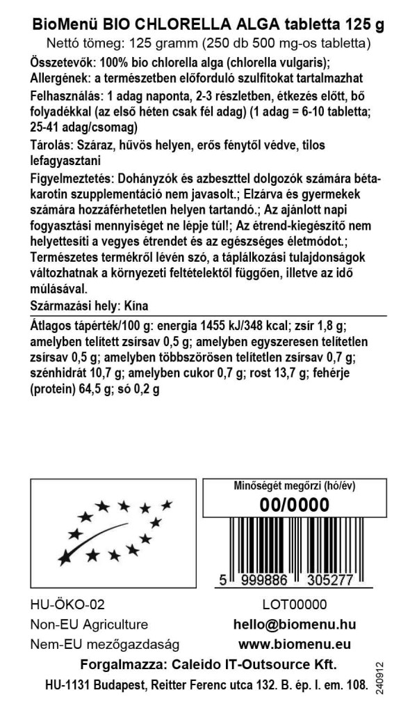 Pudra ușor digerabilă este o sursă naturală de multe vitamine, minerale, aminoacizi, fibre și clorofilă legate biologic. Conținutul concentrat de nutrienți al unei porții de tablete BioMenü Chlorella este echivalent cu o porție de salată verde pentru adulți.