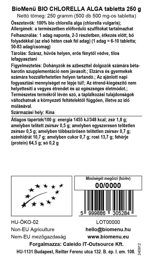Pudra ușor digerabilă este o sursă naturală de multe vitamine, minerale, aminoacizi, fibre și clorofilă legate biologic. Conținutul concentrat de nutrienți al unei porții de tablete BioMenü Chlorella este echivalent cu o porție de salată verde pentru adulți.