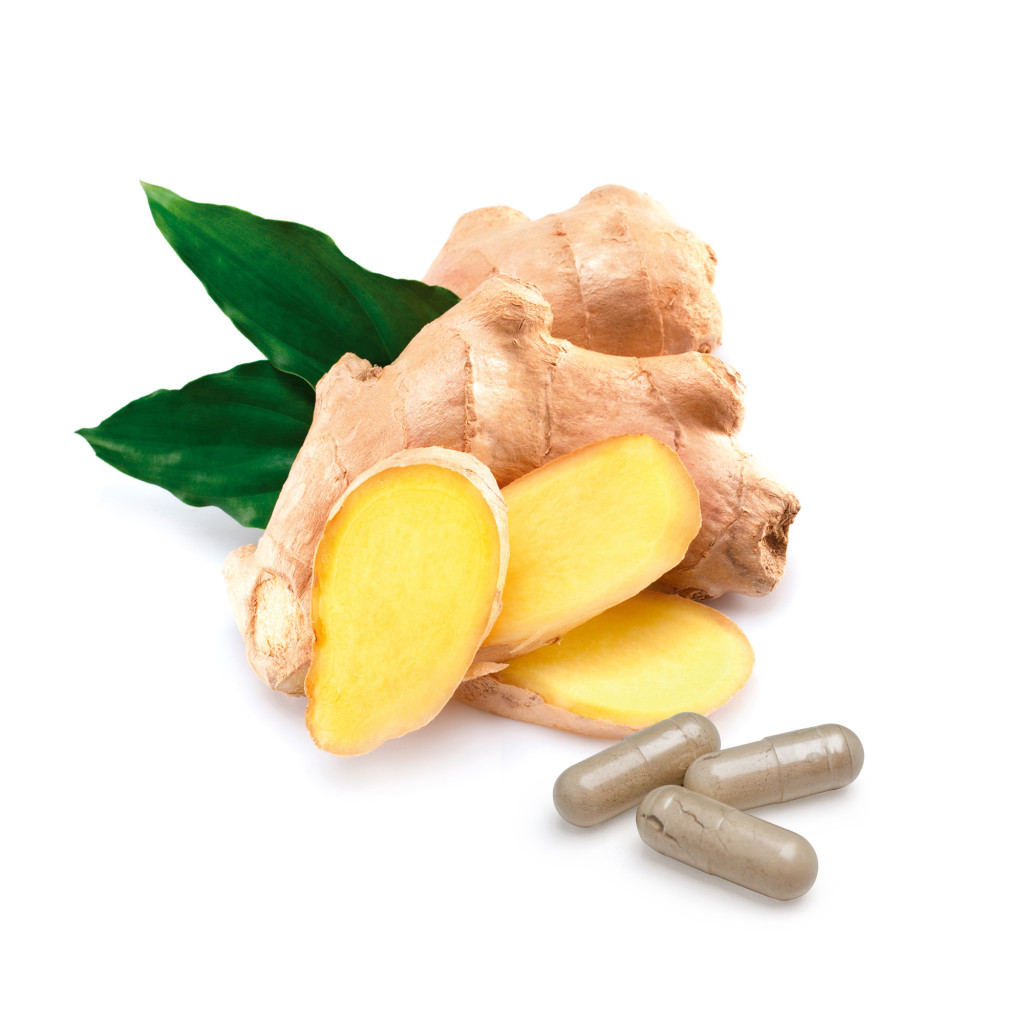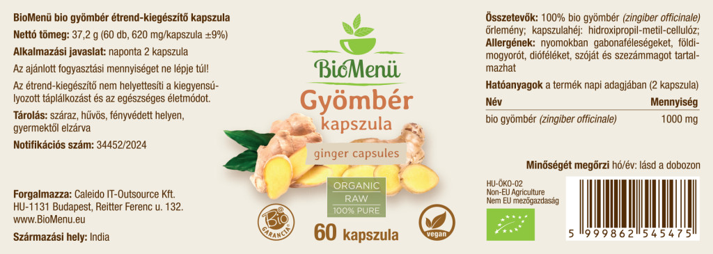 100% ghimbir organic (zingiber officinale) macinat; învelișul capsulei: hidroxipropil metilceluloză; Alergeni: pot contine urme de cereale, arahide, nuci, soia si seminte de susan