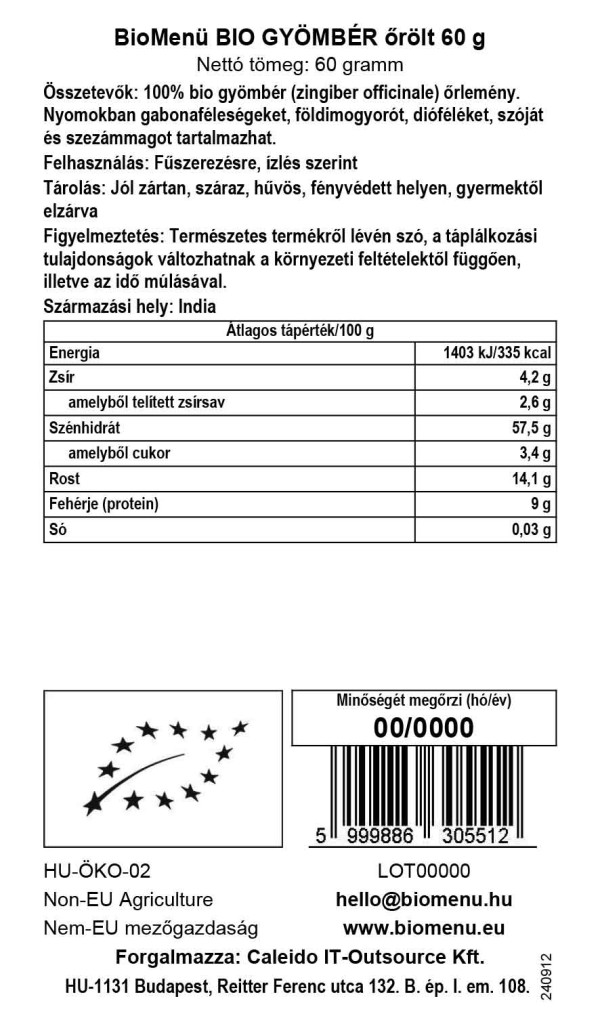 100% ghimbir organic (zingiber officinale) măcinat. Poate contine urme de cereale, arahide, nuci, soia si seminte de susan.