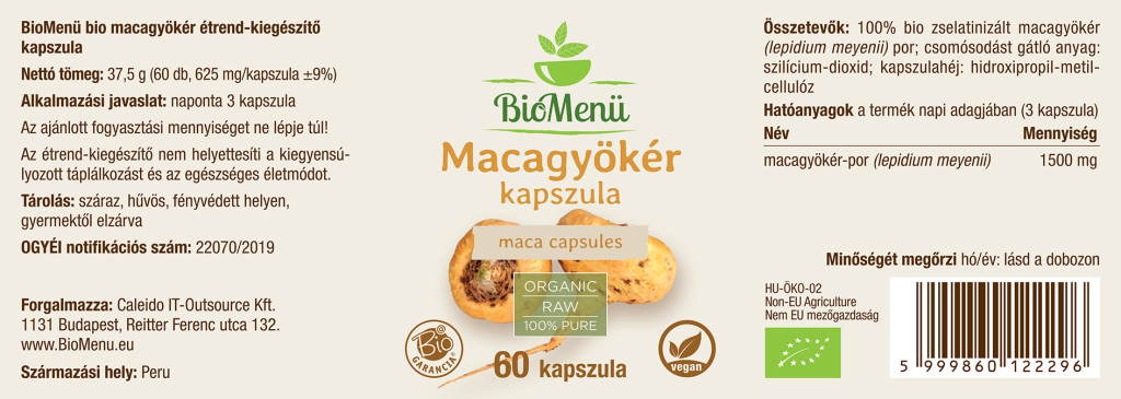 100% pudră organică de rădăcină de maca gelatinizată (lepidium meyenii); agent antiaglomerant: dioxid de siliciu; învelișul capsulei: hidroxipropil metilceluloză