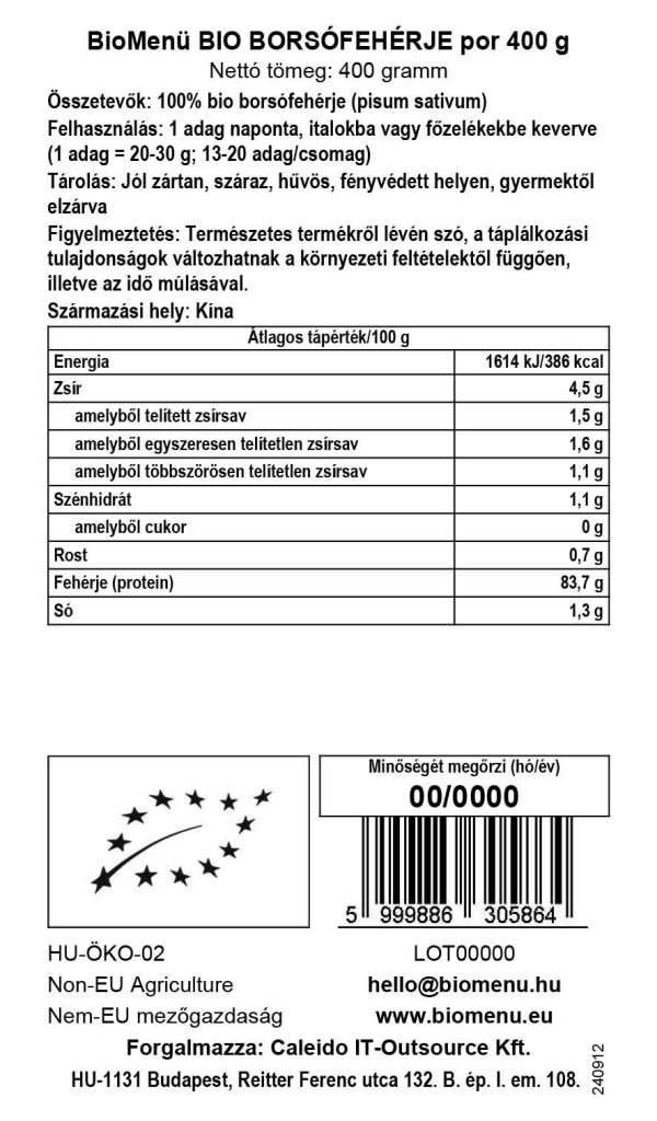 Pudra BioMenü BIO BORSÓFÉHÉRJE este realizată din mazăre selectată, curățată, cultivată în condiții controlate. O sursă naturală de proteine ​​de bună calitate, care nu conține colesterol. Este fără OMG, non-alergenic și nu conține metale grele, pesticide, substanțe de origine animală sau poluante. Cu nenumăratele sale posibilități de utilizare, este un mijloc de primă clasă de introducere a proteinelor vegetale în organism.